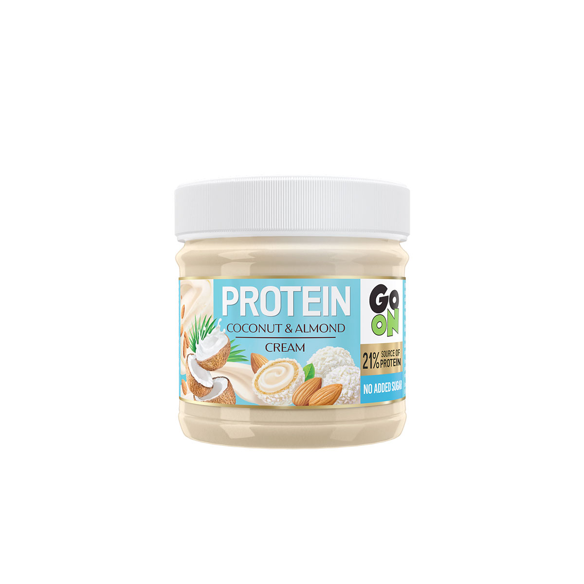 Proteinski krem sa kokosovim pahuljicama i pečenim bademima. Sa zaslađivačem. Bez dodatog šećera. Sadrži prirodno prisutne šećere.